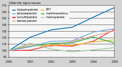 2000-luvulla suurin osa KIBS-aloista on ollut selkeällä kasvu-uralla. Voimakkaimmin arvonlisäys on kasvanut kirjanpitopalveluissa, seuraavaksi konsulttipalveluissa, lakiasiainpalveluissa ja teknisissä palveluissa. Viime mainittujen alojen arvonlisäyksen kasvun erot ovat niin pieniä, että niiden keskinäinen järjestys riippuu täysin tarkastelun lähtövuodesta. Kaikki edellä mainitut alat ovat kehittyneet selvästi paremmin kuin koko bruttokansantuote. Heikoimmin on kehittynyt mainospalvelujen tuotannon arvo, jonka arvonlisäys on hädin tuskin positiivinen. Markkinatutkimuspalveluissa kehitys on lähes yhtä heikko.