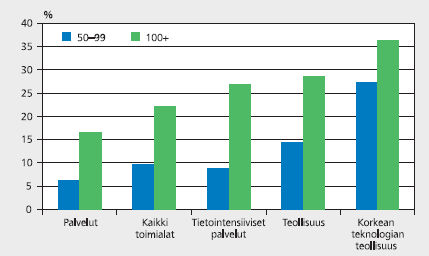 Toimintojen siirtäminen ulkomaille oli selvästi yleisintä korkean teknologian teollisuusyrityksissä, joihin luetaan mm. koneiden ja laitteiden sekä elektroniikan ja sähkötuotteiden valmistus. Näistä kolmannes oli ulkoistanut tai siirtänyt toimintojaan ulkomaille, yli sadan hengen yrityksistä jopa 36 prosenttia. Muussa teollisuustuotannossa toimintojen siirtäminen on ollut selvästi harvinaisempaa.