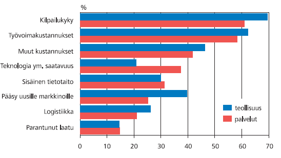 Myös muut kustannukset kuin työvoimakustannukset olivat vähentyneet lähes puolessa yrityksistä. Ulkoistamisen tai toimintojen siirtojen muita positiivisia vaikutuksia esimerkiksi yrityksen sisäiseen tietotaitoon tai pääsyyn uusille markkinoille ilmoitettiin selvästi harvemmin.