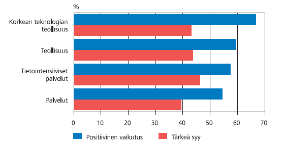 Teollisuus- ja palveluyritysten käsitykset toimintojen ulkoistamisen tai siirtämisen vaikutuksista poikkesivat selvästi teknologian saatavuuden suhteen. Palveluyritykset arvioivat ulkoistamisen parantaneen teknologian saatavuutta selvästi useammin kuin teollisuusyritykset. Toisaalta teollisuusyritykset pääsivät mielestään uusille markkinoille ulkomaille siirtymisen seurauksena useammin kuin palveluyritykset.