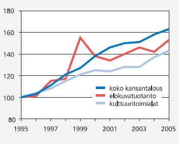 Kuvio 1. Elokuvatuotannon ja kansantalouden ja kaikkien kulttuurialojen arvonlisäys 1995-2005 (1995=100)