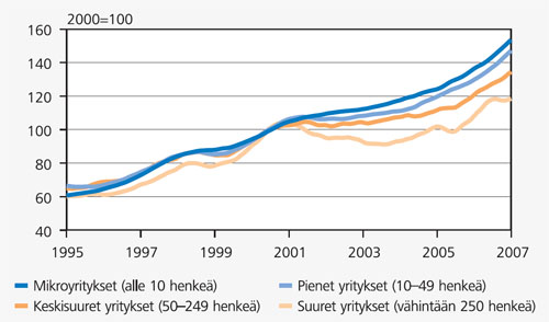 Eri kokoisten yritysten kehitys on liikevaihtokuvaajien mukaan eriytynyt 2000-luvulla. Vuodesta 2001 alkaen pk-yritysten liikevaihto kasvoi keskimäärin 5 prosenttia vuodessa, kun suurten yritysten liikevaihdon kasvu jäi noin puoleen siitä. (Kuvio 1.) Pienten yritysten nopeampi kasvu saattaa olla merkki siitä, että globalisaation myötä Suomen talous olisi muuttunut hieman yrittäjävetoisemmaksi. Tätä uumoili Etlatiedon toimitusjohtaja Pekka Ylä-Anttila seminaarissa Tilastokeskuksessa 19.4.2007.