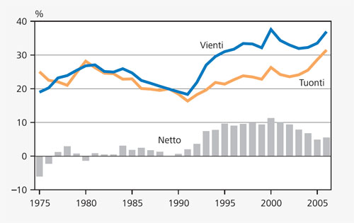 Kuvio 2. Tavarakauppa suhteessa bruttokansantuotteeseen 1975-2006