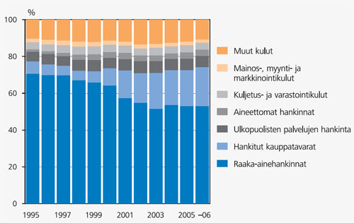 Kuvio 4. Tehdasteollisuuden ostokulujen rakenteen muutos 1995-2006