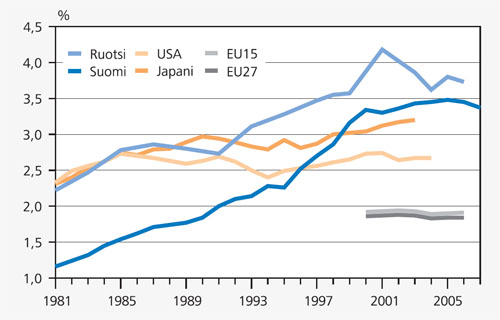 Tutkimus- ja kehittämismenot ovat eräs selkeimmin mitattavissa oleva aineeton tekijä. T&k-menojen suhde bruttokansantuotteeseen kasvoi Suomessa voimakkaasti 1990-luvun lopulla (kuvio 5). Myös patenttien määrä korreloi talouskehityksen kanssa: patentit liittyivät merkittävään osaan viennin kasvusta Suomessa 1990-luvulla. Tilastoilla pystymme mittaamaan panostuksia t&k-toimintaan ja patentointiin kansallisesti, mutta emme sitä, minkä verran Suomessa hyödynnetään ulkomaisen t&k-toiminnan tuloksia tai päinvastoin.