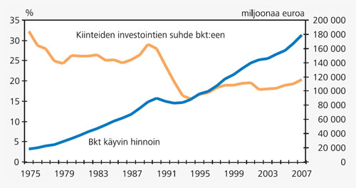 Kuvio 6. Kiinteän pääoman bruttomuodostuksen suhde bruttokansantuotteeseen sekä bruttokansantuote 1975-2007