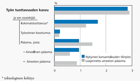 Toinen havainto on se, että nykyisin paljon esillä olevien kasvulaskenta-analyysien tulokset muuttuvat melko merkittävästi, kun aineettomat investoinnit nostetaan tasa-arvoiseen asemaan aineellisten investointien rinnalle. Korjauksen jälkeen pääoman suora vaikutus kasvaa. Kokonaistuottavuuden merkitys on edelleen suuri, mutta kuitenkin selvästi pienempi kuin aikaisempien analyysien perusteella on näyttänyt.