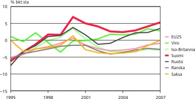 Kun tarkastellaan nykyisten EU-maiden julkisen ylijäämän ja velan kehitystä vuodesta 1995 vuoteen 2007, Suomen kehityksessä voidaan havaita joitakin poikkeuksellisia piirteitä. Silmiinpistävä kehityskulku liittyy alijäämään. Vuoden 1995 alijäämä, 6,2 prosenttia bruttokansantuotteesta, oli EU-maiden suurimpien joukossa. Vuoteen 2007 mennessä Suomen tilanne on kääntynyt päälaelleen niin, että Suomen 5,3 prosentin ylijäämä on EU-maiden joukossa kaikista suurin (Kuviot 1 ja 2). Tätäkin korkeammalla tasolla Suomen ylijäämä kävi vuonna 2000.