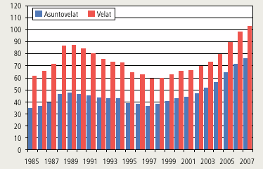 Tällä vuosikymmenellä sekä velkojen määrä että niiden osuus vuosituloista on kasvanut niin paljon, että kotitalouksien velkaantumisaste on jo ylittänyt 1990-luvun vaihteen tason. Vuodesta 2000 vuoteen 2007 kotitalouksien velat kasvoivat 219 prosenttia, ja asuntovelat lisääntyivät peräti 247 prosenttia.
