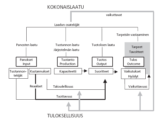 Tuotoksen laatu on jatkuvan keskustelun aihe julkisen sektorin tuottavuutta mitattaessa. Markkinatuotannossa hyödykkeiden hintaerojen oletetaan heijastavan laatua, mutta julkisen palvelun laadun muutokset täytyy havaita muilla keinoilla. Laadun käsite Tilastokeskuksen tilastoissa on rajattu koskemaan vain osaa laaduksi ymmärrettyjä ominaisuuksia. Kuviosta 1 nähdään, että laatuna voidaan käsittää useat eri asiat riippuen näkökulmasta.