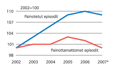 Tuotosten painotuksen välttämättömyys erikoissairaanhoidossa on näkyvissä kuviossa 2. Huomiota herättää, että painottamattomien episodien volyymi on pysynyt lähes samana vuosien 2002 ja 2007 välillä, mutta painotettujen episodien volyymi on samanaikaisesti kasvanut kymmenisen prosenttia. Tulkinta tälle tilanteelle on, että hoidot ovat muuttuneet yhä vaativammiksi (ja kalliimmiksi). Syynä tähän voi olla se, että sairaudet ovat keskimäärin vaikeampia tai annetut hoitoepisodit ovat keskimäärin laadukkaampia ts. samaa sairautta hoidetaan vaativammilla hoitojaksoilla, vaikkapa parempien hoitotulosten saavuttamiseksi.