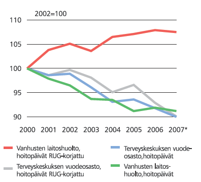 Vanhusten laitoshoidossa on merkittävä ero laatukorjatun ja korjaamattoman tuotoksen volyymi-indeksin välillä. Hoitopäivien määrä on laskenut vuosina 2000-2007 noin kahdeksan prosenttia, mutta keskimääräisen potilaan hoitovaativuus on kasvanut samalla niin merkittävästi, että laatukorjatun tuotoksen volyymi on kasvanut noin kahdeksan prosenttia. Selityksenä tälle kehitykselle voi olla se, että vanhusten palveluasumista tuetaan voimakkaasti ja vanhusten laitoshuollon hoitovuorokausia on yhä vähemmän, mutta samalla laitoshuoltoon tulevat ovat iäkkäämpiä ja huonompikuntoisia. Tämä kehitys tulee huomioiduksi käyttämällä RUG-luokitukseen perustuvaa laatukorjausta vanhustenhoidossa. RUG-kertoimilla saadaan sama lopputulos kuin silloin, jos hoitopäiviä olisi seurattu suoraan eri laatuluokissa kustannukset laskettuna.