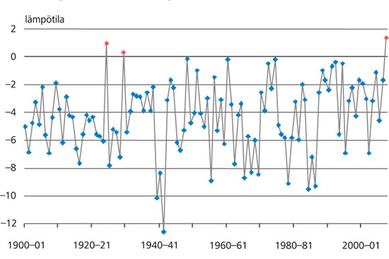 Vuodesta 1900 lähtien koko talven keskilämpötila on ylittänyt Helsingissä vain kolme kertaa 0-asteen rajan. Lisäksi muutamia kertoja on päästy aivan nollan tuntumaan (Kuvio 1). Ilmaston lämpeneminen parin viime vuosikymmenen aikana näkyy etenkin siten, että kylmät talvet ovat alkaneet harvinaistua.