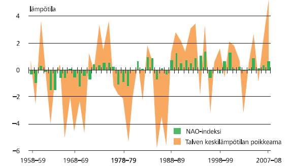 Skandinavian ja Suomen lauhoihin talviin liittyy usein positiivinen NAO-indeksi. Tällöin lauhat lännen ja lounaan väliset tuulet ovat vallitsevina. Kylmät talvet osuvat tyypillisesti indeksin negatiiviseen vaiheeseen (Kuvio 2). Kesäaikana NAO-indeksillä ja Pohjois-Euroopan lämpötiloilla ei ole samanlaista riippuvuutta kuin talvella.