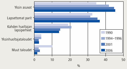 Kuvio 1. Nuorten kotitaloudet kotitaloustyypin mukaan vuosina 1990, 1994-1996, 2001 ja 2006. Prosenttia.