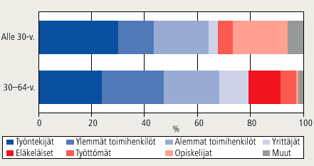 Nuorten kotitaloudet eroavat sosioekonomiselta rakenteeltaan muun työikäisen väestön kotitalouksista (kuvio 2). Ammatissa toimivien osuus oli nuorten talouksissa selvästi vanhempien työikäisten kotitalouksia pienempi vuonna 2006. Opiskelijatalouksia oli nuorten joukossa vastaavasti suhteessa enemmän. Hyvässä kulutusasemassa olevien ylempien toimihenkilöiden talouksien osuus oli puolestaan selvästi pienempi kuin 30-64-vuotiaiden talouksissa, mutta työntekijätalouksien osuus oli suurempi.