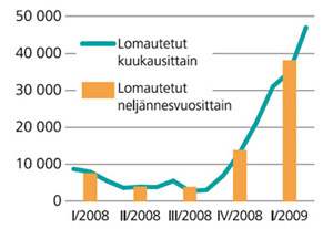 Talouden noususuhdanteen aikana lomautukset ovat varsin marginaalinen ilmiö, mutta taantuman myötä ne yleistyvät hyvin nopeasti. Tilastokeskuksen työvoimatutkimuksen mukaan lomautettujen määrä oli muutaman tuhannen palkansaajan verran aina syksyyn 2008 saakka. Lomautusten lisääntyminen näkyi selvästi jo viime vuoden viimeisellä neljänneksellä, mutta varsinaisesti lomautettujen määrän kasvu ajoittuu kuluvan vuoden alkuun (kuvio 1). Lomautukset alkoivat lisääntyä lokakuun 2008 paikkeilla, ja kasvu on jatkunut katkeamattomana viimeisen puolen vuoden ajan. Vuoden 2009 ensimmäisellä neljänneksellä lomautettuna oli noin 38 000 palkansaajaa eli viisinkertainen määrä vuodentakaiseen vastaavaan ajankohtaan verrattuna.