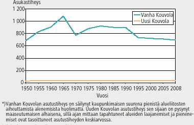 Kouvola puolestaan on entinen kaupunki, josta tuli vuoden 2009 kuntaliitosten myötä harvaanasuttu alue. Asukastiheyden kasvu kuvaa hyvin vanhan Kouvolan kaupungistumiskehitystä, mutta kuntaliitosten jälkeistä aluetta tarkasteltaessa voidaan väittää asukastiheyden pysyneen vuosikymmeniä lähes samana (kuvio). Vanhan Kouvolan asukastiheyden notkahdukset selittyvät alueliitoksilla.