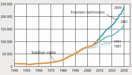 Vuoden 2001 väestöennusteen mukaan Suomessa oli 94 500 yli 85-vuotiasta vuoden 2008 lopussa, mutta todellisuudessa heitä oli 103 800. Ennusteen virhe on siis 9 prosenttia seitsemässä vuodessa, ja kertautuessaan ennustevirhe on aikamoinen vuonna 2040. (Kuvio 2.)