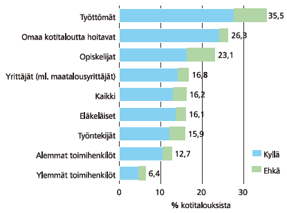 Taloustilanteen vakavuuteen rinnastettuna osuudet vaikuttavat ehkä yllättävän pieniltä. Väestöryhmittäin joulukulutuksesta pidättäytymisessä ilmenee kuitenkin suuria eroja (Kuvio 1). Työttömistä runsas kolmannes aikoo tinkiä rahankäytöstä jouluna ja muista vähävaraisista, opiskelijoista ja omaa kotitaloutta hoitavista noin joka neljäs.
