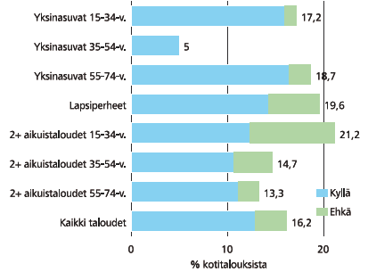 Keskimääräistä vähemmän aikovat tinkiä myös sellaiset kahden tai useamman aikuisen muodostamat taloudet (2+), joissa jäsenet ovat yli 55-vuotiaita. Sen sijaan alle 35-vuotiaiden 2+ -aikuistaloudet sekä lapsiperheet aikovat suhteellisesti varmimmin supistaa rahankäyttöään tänä jouluna.