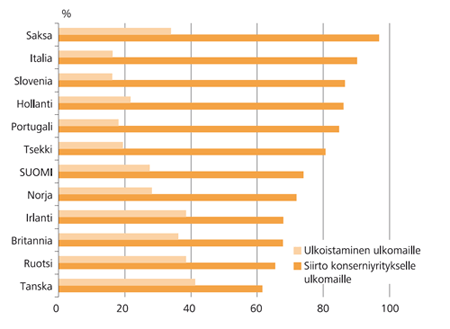 Tanskalaisissa ja ruotsalaisissa yrityksissä tietotekniikkatoimintojen siirrot konserniyritykselle ulkomaille olivat harvinaisempia ja ostot ulkopuolisilta yleisempiä kuin muissa maissa. Suomi edusti suunnilleen keskivertomaata tietotekniikkatoimintojen konsernin sisäisissä siirroissa sekä ulkoistamisessa ulkomaille.