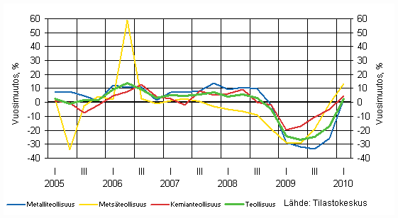 Teollisuuden suhdannetilanne jatkuu yhä vaikeana, vaikka varovaisia merkkejä myönteisestä kehityksestä on jo näkynyt alkuvuodesta. Vuoden 2010 ensimmäisellä neljänneksellä tuotanto kasvoi kaikilla teollisuuden päätoimialoilla edelliseen vuoteen verrattuna. Tuotannon volyymi on kuitenkin yhä kaukana syksyllä 2008 alkanutta taantumaa edeltäneestä tasosta.