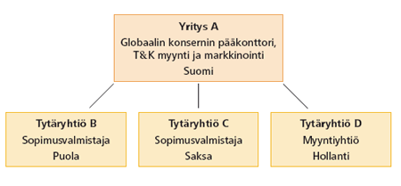 Globalisaation aiheuttamaa muutosta yritystoiminnassa voidaan kuvata paremmin seuraavan kuvitteellisen esimerkin avulla. Oletetaan esimerkkikonserni, joka on monikansallinen ja valmistaa autoja. Esimerkissä konsernin emoyhtiö A sijaitsee Suomessa. Tämä yritys A valmistuttaa autot tytäryhtiöillään B ja C sopimusvalmistuksena Puolassa ja Saksassa. Lisäksi konserniin kuuluu autojen tukkukauppaa hoitava tytäryhtiö D Hollannissa.