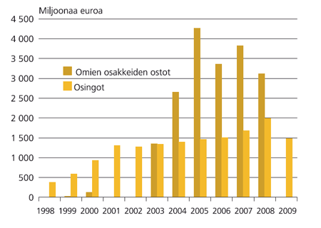Eräs tapa, jolla yritys voi käyttää jakamattomia voittovarojaan, on omien osakkeiden takaisinosto. Kun Suomessa sallittiin amerikkalaistyylinen omien osakkeiden takaisinosto, on ilmiöstä tullut hyvin merkittävä osakkaiden palkitsemismuoto. Useina vuosina Nokia maksoi osinkoja vain puolet siitä summasta, millä se osti omia osakkeitaan (Kuvio 1). Toki suomalaisetkin saivat tuloja muualta samalla tavoin, mutta Nokian valtavasta koosta johtuen sen suorittamat osakkeiden takaisinostot hallitsevat kokonaiskuvaa ja rahavirtoja. 2