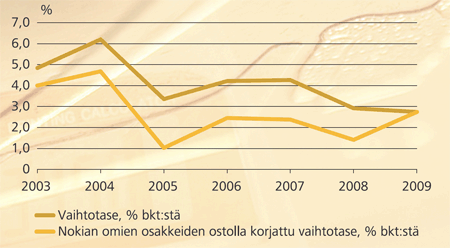 Kuviossa 2 esitetään yksinkertaistettu laskelma siitä, miltä Suomen vaihtotase näyttäisi, jos Nokian omien osakkeiden ostojen vaikutus kirjattaisiin samalla tavalla kuin maksetut osingot. Nokia osti vuosina 2003–08 omia osakkeitaan 18,6 miljardilla eurolla. Vaikutus oli suurimmillaan 2,3 prosenttia bkt:stä vuonna 2005 ja koko ajanjaksona keskimäärin 1,6 prosenttia bkt:stä. Vuonna 2009 Nokia ei enää ostanut omia osakkeita.