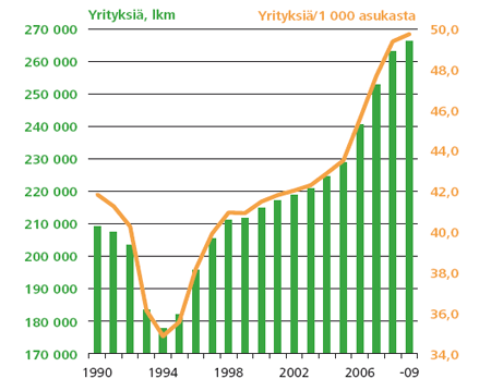 Suomessa toimii yrityksiä enemmän kuin koskaan. Työ- ja elinkeinoministeriö TEM:n ennakkoarvioiden mukaan yrityksiä oli lähes 270 000 vuonna 2009, kun alkutuotannon toimialoja ei oteta lukuun. 15 vuodessa yritysten määrä on kasvanut 50 prosenttia. Yritysten määrä on lisääntynyt jopa nykyisen taantuman aikana (Kuvio 1).
