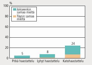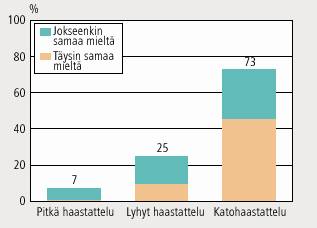 Myös näkemys tutkimuksen vaatimasta ajasta poikkesi selkeästi sen suhteen, osallistuiko henkilö vain katohaastatteluun, lyhyeen haastatteluun vai pitkään haastatteluun (kuvio 4). Jopa kolme neljästä katohaastatteluun osallistuneista piti tutkimuksen vaatimaa aikaa liian pitkänä. Lyhyeen haastattelun osallistuneista tätä mieltä oli noin joka neljäs ja eniten aikaansa uhranneista eli pitkään haastatteluun osallistuneista vain 7 prosenttia.