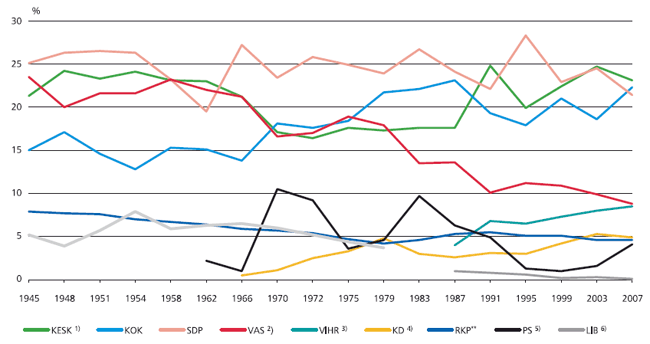 Kuvio 1. Puolueiden kannatus eduskuntavaaleissa 1945–2007