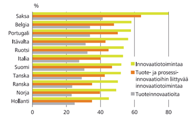 Yleisintä innovaatiotoiminta oli Saksassa, missä innovaatiotoimintaa harjoittaneita yrityksiä oli Eurostatin mukaan selvästi enemmän kuin muissa maissa. Suomen kohdalla merkillepantavaa on tuote- ja prosessi-innovaatioihin liittyvää toimintaa ilmoittaneiden korkea osuus kaikista innovaatiotoimintaa harjoittaneista. Tuote- ja prosessi-innovaatioihin liittyvän toiminnan yleisyydessä Suomi onkin Euroopan kärkimaita. Kun sen sijaan mukaan lasketaan myös ei-teknologisten innovaatioiden käyttöönotto, Suomen sijoitus innovaatiotoiminnan yleisyyttä kuvaavalla listalla heikkenee. Suomessa markkinointi- ja organisaatioinnovaatioista ilmoittavat lähinnä muutoinkin innovoivat yritykset. Pelkästään ei-teknologisia innovaatioita käyttöön ottaneiden yritysten osuus oli suhteellisen pieni. Portugalin tilanne oli tässä suhteessa hyvin samankaltainen.