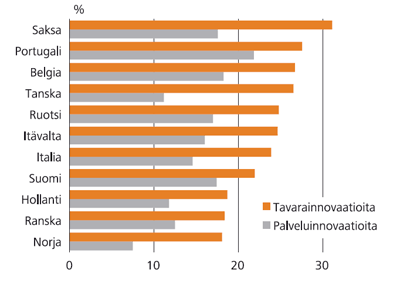 Vertailussa mukana olleista maista Suomessa, Tanskassa, Saksassa ja Portugalissa tuoteinnovaatioista saatu liikevaihto edusti noin viidennestä tuote- ja prosessi-innovaatioihin liittyvää toimintaa harjoittaneiden yritysten yhteenlasketusta liikevaihdosta vuonna 2008. Belgiassa, Itävallassa, Hollannissa ja Ruotsissa osuus oli vastaavasti noin 15 prosenttia.