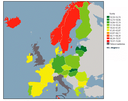 Suomen sijainti Euroopan terveyskartalla on huonompi kuin muiden Pohjoismaiden ja useimpien muiden EU-maiden. Vain Itä-Euroopan maissa ja Saksassa on vielä heikommat lukemat. Suomessa syntyvällä poikalapsella on odotettavissaan 57 tervettä elinvuotta kaikkiaan 77 elinvuodesta, mikäli nykyisenkaltaiset kuolleisuus- ja terveysjakaumat säilyvät ennallaan. Islantilaispoikalapsi voi odottaa elävänsä terveenä yli 70 vuotta 80 elinvuodestaan. Suomessa 65 vuoden iän saavuttanut mies voi odottaa elävänsä terveenä vielä kahdeksan vuotta ja Islannissa 13.