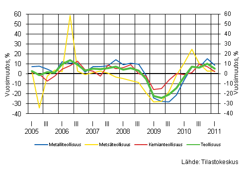 Teollisuuden suhdannetilanne säilyi kohtalaisen hyvänä vuoden 2011 alussa. Tuotannon kehitys ei kuitenkaan jatkunut vuoden ensimmäisellä neljänneksellä yhtä hyvänä kuin viime vuoden lopussa. Erityisesti tammikuu oli tuotannon osalta haastava. Tammikuun jälkeen tuotanto on kuitenkin jälleen päässyt melko hyvälle kasvu-uralle useilla toimialoilla. Myös uusia tilauksia on saatu runsaasti.