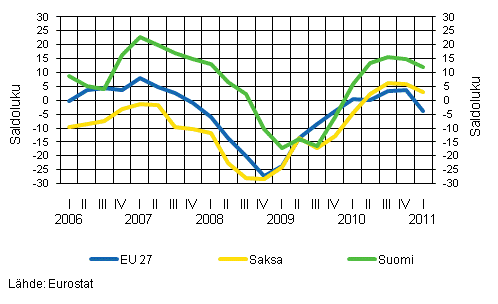 Suomen vähittäiskaupan suhdannetilanne oli ensimmäisellä vuosineljänneksellä selvästi EU-keskiarvoa parempi. Vähittäiskaupan yritysten suhdannetilannetta kuvaavan luottamusindikaattorin saldolukujen taso on ollut Suomessa jo usean vuoden ajan korkeampi kuin EU:n alueella keskimäärin. Euroalueella vähittäiskaupan luottamus saavutti huippunsa joulukuussa ja laski sitten takaisin ensimmäisen neljänneksen aikana, vaikka indikaattori onkin selvästi pitkän aikavälin keskiarvon yläpuolella.