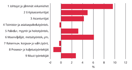Tarkasteltaessa palkansaajarakenteen muutosta ammattiluokituksen avulla, vahvistuu ID-indikaattorin avulla saatu tulos. Naisten suhteellinen osuus on kasvanut korkeaa ammattitaitoa vaativissa ammateissa. Naisten osuus johtajista on kasvanut erityisesti, mihin ovat oletettavasti vaikuttaneet osaltaan valtiohallinnossa asian edistämiseksi käynnistetyt hankkeet.
