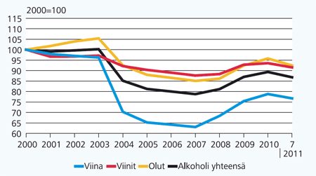 Viinan, viinien ja oluen vähittäismyynnin reaalihintakehitys 2000 – 2011