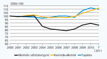 Alkoholin vähittäismyynnin, ravintola-alkoholin ja tupakan reaalihintakehitys 2000 – 2011