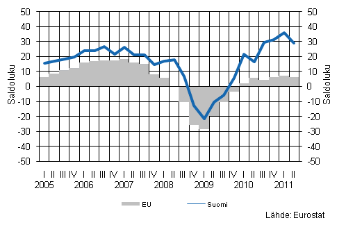 Eurostatin luottamusindikaattorin mukaan palvelualojen suhdannetilanne pysyi EU-maissa vakaana vuoden toisella neljänneksellä. Luottamusta kuvaava saldoluku laski hieman sekä EU:ssa että Suomessa edelliseen neljännekseen nähden. Suomessa saldoluku on edelleen selvästi pitkän ajan keskiarvoa korkeampi, EU-maiden jäädessä hieman keskiarvoa alemmaksi. Kotimaisten palveluyritysten kysyntä on kehittynyt myönteisesti ja sen odotetaan jatkuvan varsin myönteisenä myös tulevina kuukausina. Työllisyystilanne on parantunut tasaisesti ja työllistymismahdollisuuksia palvelualoilla pidetään edelleen hyvinä. Tuottajahintojen odotetaan edelleen jatkavan nousuaan lähikuukausina.