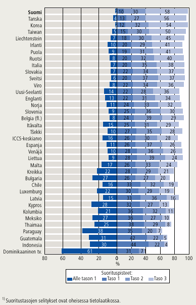 Suomalaisista nuorista 58 prosenttia yltää kolmannelle taitotasolle, mikä on paras tulos osallistuneiden maiden joukossa. Vastaavasti alimmalla tasolla (taso 1 tai vähemmän) on 12 prosenttia suomalaisista oppilaista eli pienempi osuus kuin missään muussa maassa. (Suoninen ym. 2010a; kuvio 1.)