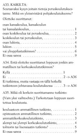 Luettelon kolme viimeistä syytä (2–4) koskevat tilanteita, joissa haastattelussa saatu pohjakoulutustaso on korkeampi kuin rekisteritieto (tummennetut luvut). Vaikeus määritellä oman tutkintonsa taso (kohta 1) voi olla molempiin suuntiin: omaa tutkintoa pidetään joko ylempänä tai alempana kuin se koulutusluokituksen mukaan on.