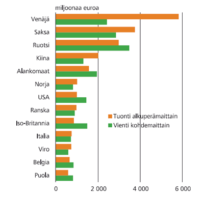 Vienti on kuitenkin vain kolikon toinen puoli, sillä usein sekä vienti että tuonti kulkevat käsi kädessä. Itse asiassa tavarakauppamme Venäjän ja Saksan kanssa on selvästi alijäämäistä eli tuonti näistä maista ylittää reilusti viennin arvon.