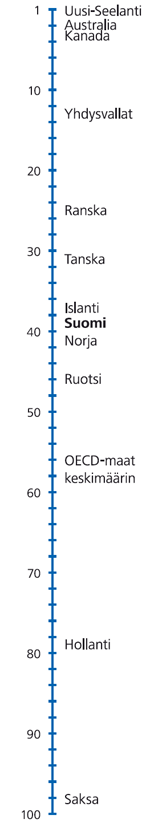| Muihin Pohjoismaihin verrattuna Suomi jää jälkeen etenkin Tanskasta, jonne uusi yritys on helpointa perustaa Pohjoismaissa. Suomeen on kuitenkin helpompaa perustaa yritys kuin Ruotsiin tai Norjaan. Pohjoismaiden toisiaan hyvin lähellä olevat sijoitukset heijastavat maiden yhteiskunnallista yhtenäisyyttä. | |
