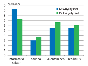 Muista toimialoista poiketen informaatiosektorilla toimivien kasvuyritysten kannattavuus on parisen prosenttiyksikköä muita toimialan yrityksiä korkeammalla – eli kasvuyritykset informaatiosektorilla kannattavat paremmin kuin muut saman toimialan yritykset.