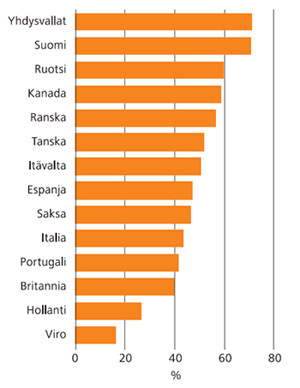 Useissa suurissa talouksissa yli 250 henkilöä työllistävien yritysten osuus on alle puolet viennin arvosta – esimerkiksi Saksassa, Espanjassa ja Italiassa noin 45 prosenttia. On huomattava, että eteläisessä naapurissamme Virossa suurten yritysten merkitys viennistä oli erityisen pieni, vain noin 15 prosenttia.