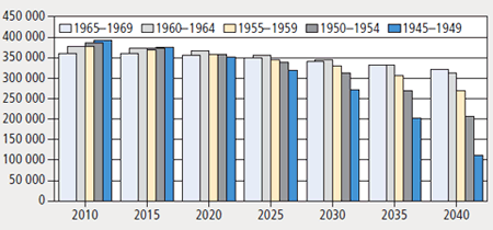 Vuoden 2009 väestöennusteen mukaan suuret ikäluokat ovat vielä toistaiseksi hieman suurempia kuin seuraavat 5-vuotisikäkohortit, mutta jo vuonna 2015 nuoremmat ikäluokat aina 1960-luvun puoliväliin syntyneisiin saakka ovat yhtä suuria kuin suuret ikäluokat (kuvio 2). Väestöennusteen mukaan Suomen väestörakenne muuttuu merkittävästi vuoteen 2040 mennessä. Suurten ikäluokkien vaikutus on tuolloin jo hävinnyt, ja kaikki ikäluokat 60-vuotiaista alaspäin alkavat olla samansuuruisia, joskin syntyvät ikäluokat ovat edeltäjiänsä pienempiä. (Kuvio 3.)