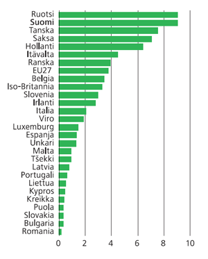 EU-maissa haettiin keskimäärin neljä patenttia tuotettua bkt-miljardia kohden. Erot eri EU-maiden välillä ovat kuitenkin varsin suuret. Suomi ja Ruotsi ovat kärkimaat yhdeksällä haetulla patentilla bkt-miljardia kohden (Kuvio 2). Patentteja haetaan siis Suomessa ja Ruotsissa yli kaksi kertaa yleisemmin kuin EU:n keskivertomaassa.